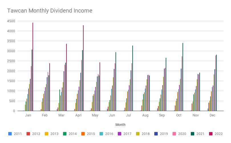 Most importantly, our dividend income has grown organically by $1,740.44 after five months or an average of $348 per month. If we can continue at this pace, it’d mean our dividend income would grow organically by ~$3,600 in 2022.